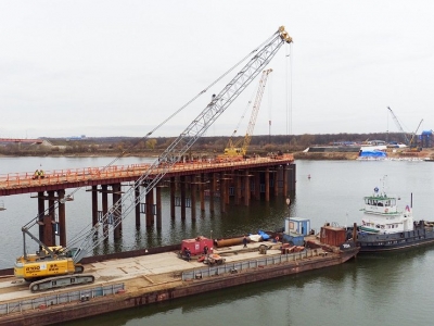 В рамках подготовки к строительству сейчас завершается последний этап инженерно-геологических изысканий там, где планируется возведение фундаментов пилонов. Притом буровая установка подъезжает по специальному технологическому мосту — последний готов на 80 процентов, но после сдачи вантового перехода его технологический дублер демонтируют.