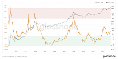 Риск резерва в настоящее время указывает на то, что мы находимся на ранней/средней стадии цикла бычьего рынка, и что в настоящее время цена далека от перегрева. Следует отметить, что во время рефлексивных бычьих циклов биткойна параболическая динамика цены служит триггером для продажи старых монет, вследствие чего динамика риска резерва становится параболической, поскольку числитель (цена) увеличивается, а знаменатель (HODL-банк) уменьшается (если MVOCD больше цены).