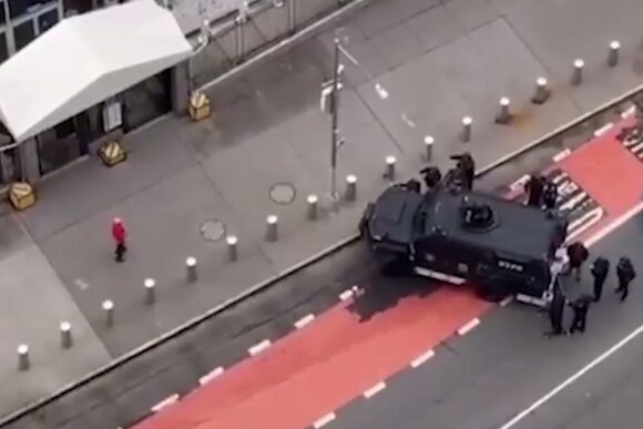 Уточняется, что полицейские с автоматическим оружием пока не приближаются к мужчине, который ходит из стороны в сторону у ограды здания ООН.