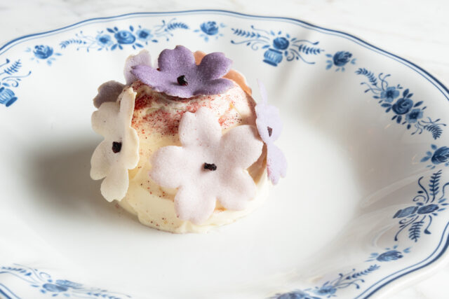 Десерт от кондитера Фатимы Салех сам напоминает весну: воздушный лимонный бисквит пропитан настойкой лимончелло и дополнен черносмородиновым конфи, миндальным крамблом и сорбетом из черной смородины. Сверху он покрыт взбитым ванильным ганашем и украшен нежными сахарными цветами лилового цвета, настолько детализированными, что видно, как проработан каждый лепесток.