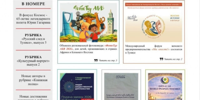 Также на страницах номера анонсированы мероприятия для соотечественников: региональный фотоконкурс «ФотоТур АБВ 2026» для детей, проживающих в странах Африки и Ближнего Востока; Международный форум женского предпринимательства «Мы вместе!» в Тунисе и Дни Ассамблеи Народов Мира в Тунисе с 23 по 29 апреля.