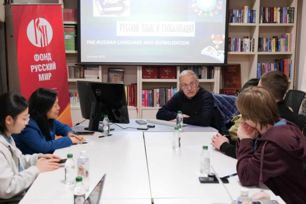 Вечером 8 апреля по приглашению руководителя Центра русского языка Пекинского университета иностранных языков (ПУИЯ) российский специалист Андрей Шевелёв прочитал лекцию на тему «Русский язык и глобализация». Мероприятие привлекло 28 слушателей: студентов-русистов Института русского языка ПУИЯ и российских студентов, обучающихся в разных институтах ПУИЯ.