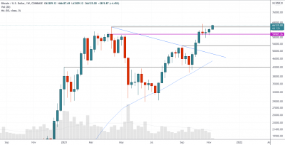 Котировки биткойна после некоторой неопределённости в прошлом выглядят довольно бычьими как на недельных, так и на дневных тайм-фреймах. Не исключено, что уже в ближайшее время мы увидим новые рекордные максимумы.