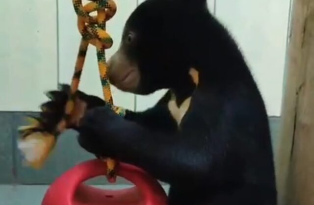Малайский медведь освоил игровую комнату в зоопарке: не испугался погремушек