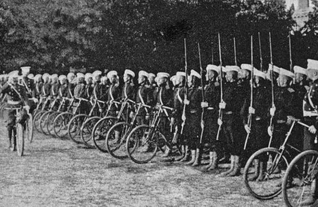 На маневрах в августе 1894-го командующий 25-й пехотной дивизией впервые разрешил своим ротным пользоваться велосипедами на марше. В результате можно было видеть весьма необычную картину: офицер накручивает педали, двигаясь впереди колонны солдат.