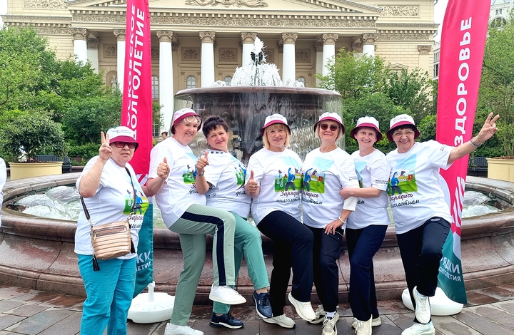 Так, например, больше ста веселых и бодрых москвичек от 60 лет и старше в белых спортивных футболках и милых фирменных «долголетовских» панамах собрались у фонтана Большого театра на утреннюю разминку. Занятия проводил известный российский гимнаст, олимпийский чемпион по спортивной гимнастике Артур Далалоян. Дамы старательно повторяли за ним все движения под ритмичную музыку.
