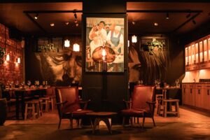 Интерьер бара отсылает к одноимённому фильму — стильный, элегантный, с нию-йоркским шармом. Тёплый желтый акцентированный свет с полумраком по углам делят зал не несколько зон: барную, со стойкой из натурального дерева по периметру, огромным проектором, танцевальным пространством и зоной посадки, под зелеными цветами (Как и Леон, бар дружит с растениями).