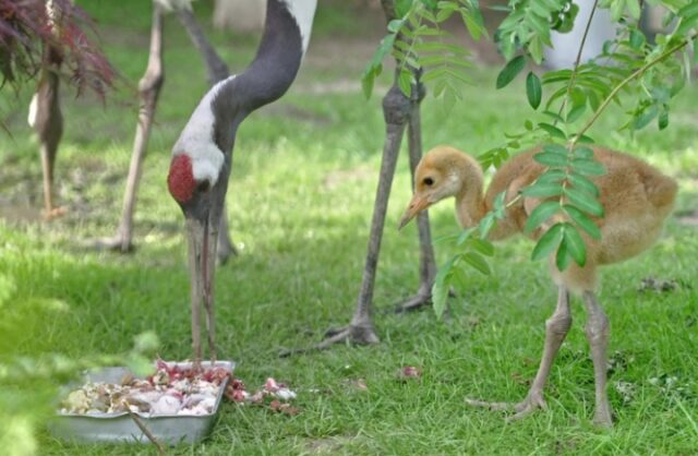 Меж тем его новоявленный младший брат пока повсюду следует за мамой и папой. Журавленок питается тем же, чем и взрослые птицы: кусочками мяса, рыбы, яйцами, творогом, а также комбикормом, насекомыми и грызунами. Но поначалу родители дополнительно измельчали пищу для малыша и кормили его из клюва.
