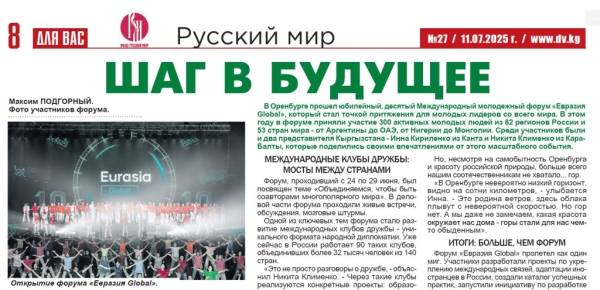 В Оренбурге прошел юбилейный, десятый Международный молодежный форум «Евразия Global», который стал точкой притяжения для молодых лидеров со всего мира. В этом году в форуме приняли участие 300 активных молодых людей из 82 регионов России и 53 стран мира — от Аргентины до ОАЭ, от Нигерии до Монголии. Среди участников были и два представителя Кыргызстана — Инна Кириленко из Канта и Никита Клименко из Кара-Балты, которые поделились своими впечатлениями от этого масштабного события.