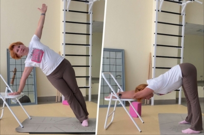 Встаньте слева от стула. Ноги стоят вместе. Правую руку поставьте на сиденье стула.Выгнитесь вверх, стараясь максимально вытолкнуть правостороннюю грудную дугу вверх (в сторону левой руки). Вытяните левую руку вверх.С каждым выдохом выталкивайте позвоночник всё сильнее.При выполнении на левую сторону при левосторонней поясничной дуге движение будет отличаться.Встаньте справа от стула. Ноги стоят вместе. Левую руку поставьте на сиденье стула.Можете выполнять упражнение в динамике: поочерёдно «проваливайтесь» в грудном отделе и выталкивайте поясничный вверх. Васишхасана – одна из самых полезных при сколиозе асан. Согласно исследованию доктора Лорена Фишмана, за шесть-семь месяцев регулярного выполнения угол Кобба (измерения сколиоза) уменьшился примерно на 40%. Для её выполнения необходимо понимать, в какую сторону направлены дуги, чтобы выталкивать позвоночник в нужном направлении. Мы описываем технику выполнения для сколиоза с правосторонней грудной дугой и левосторонней поясничной. Боковая планка — это ещё и отличное силовое упражнение: