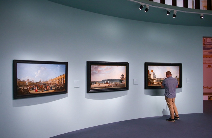 И на выставке представлен, например, цикл из 15 картин французского художника Жерара Делабарта, запечатлевшего старую Москву «до пожара». Они одинаковые по размеру, и их очень остроумно расположили в отдельном зале, повесив по кругу. Картины выполнены с фотографической достоверностью, и очень интересно посмотреть на Кремль тех времен, торговцев на Красной площади, Коломенское, Останкино, купальщиц в банях на Яузе…