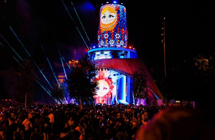 «Матрешка» состоит из гигантских колец, сделанных из стали и авиационных легких сплавов. Она поднимается на высоту 11 метров менее чем за пять минут, одна из возможных конфигураций — как раз классическая матрешка, ставшая за полтора столетия символом России. Поверхности этих колец представляют собой сплошные медиаэкраны в форме сот, на них будут транслироваться патриотические и культурно-просветительские программы. Уникальная конструкция разработана московскими инженерами и изготовлена на столичных заводах.