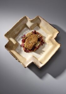 Далее подается фуа-гра с копчёным топинамбуром и карамелизированным луком