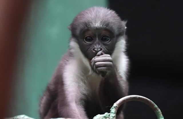 Новый малыш родился уже с открытыми глазами и покрытый шерстью. Он сразу же вцепился в маму и около двух недель жил исключительно у нее на животе. Затем новорожденный стал понемногу осваивать окружающий мир, перемещаться по веткам и даже играть со старшей сестрой. Кстати, кто именно составляет компанию Виоле — брат или сестра, пока неясно. У этого вида приматов паховая складка прикрывает половые органы, а брать малыша на руки зоологи пока не рискуют, чтобы не подвергать его лишнему стрессу.