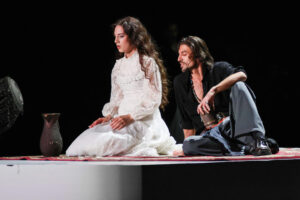 Палитра постановки не имела полутонов, только самые яркие краски — чёрное, белое, красное. Материи, из которых сложилась вещественная картина цыганского мира, — сукно, бархат, шёлк. На сцене был и белоснежный конь — живой символ самобытной культуры вольного народа, яркий акцент, который усилил чувство правды в этой истории.