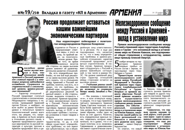 14 ноября вышла в свет очередная вкладка «Армения» в газету «Комсомольская правда в Армении».