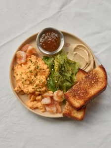 тако-панкейки из батата с тартаром из лосося и лаймовым крем-чизом (790) или с беконом и лимонным йогуртом (570), сандо с тунцом и яйцами-минутками (650), гранд-сырник с маскарпоне и черничным куле (590). Если хочется чего-то основательнее — выбирайте гречотто с грибами и фетой (590) или утренние пинццетты (550).