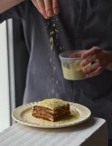 И наконец — новый десерт, фисташковый тирамису (590). Классический рецепт дополнили прослойкой из фисташкового ганаша, приготовленного из двух типов пасты, жареных фисташек и белого шоколада. Мягкий, тягучий и совершенно не приторный — тот случай, когда хочется «ещё ложку».