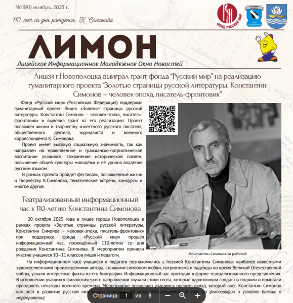 В преддверии фестиваля «Золотые страницы русской литературы. Константин Симонов — человек-эпоха, писатель-фронтовик» (пройдёт 28-29 ноября) вышел специальный номер лицейской газеты «Лимон».