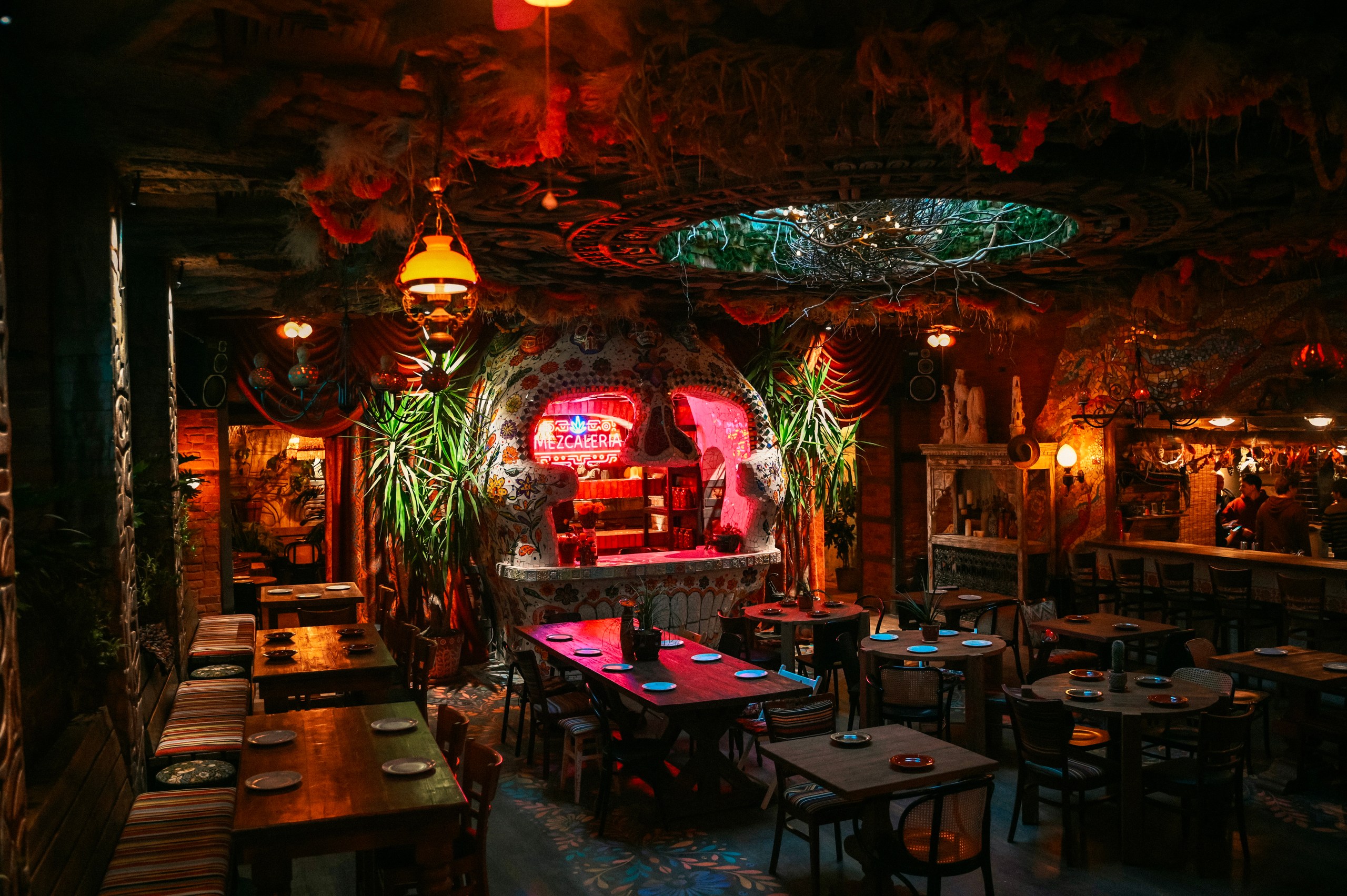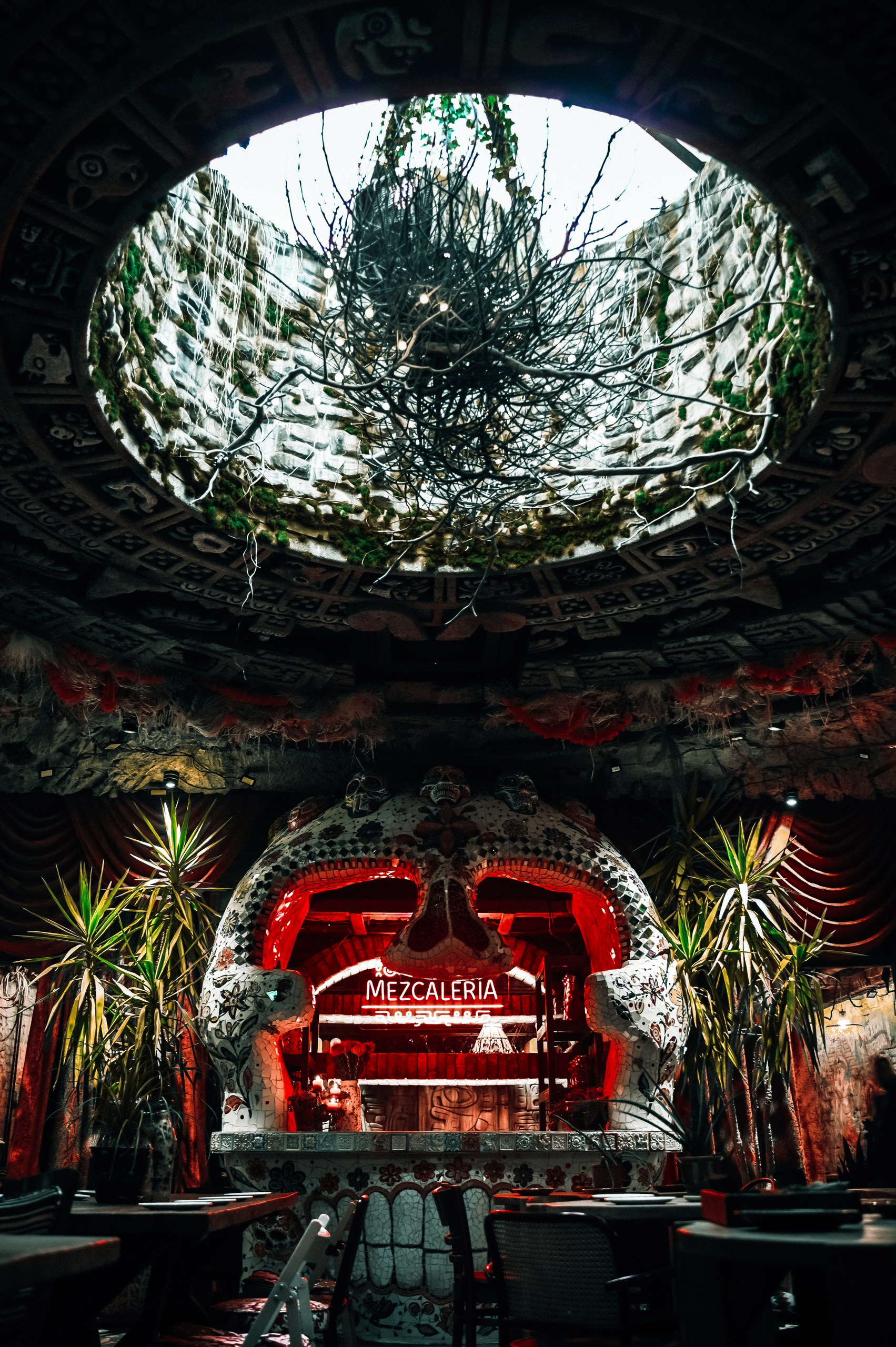 Интерьер в нем проработан до мельчайших деталей огромной командой киношников, художников и декораторов. Путешествие начинается с самого входа — здесь встречает алтарь, ящики контрабанды и украшения к празднику мертвых. Спускаемся по лестнице и попадаем в основной зал — бар в форме черепа с коллекцией мискаля и текилы, купол с колыбелью под потолком, мозаика, выложенная полностью вручную и сотни удивительных деталей.