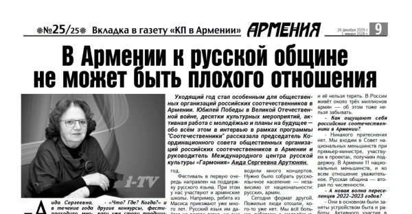 Значительное место в номере занимает интервью с председателем Координационного совета общественных организаций российских соотечественников в Армении и руководителем Международного центра русской культуры «Гармония» Аидой Арутюнян. Она подводит итоги года, посвящённого 80-летию Победы, рассказывает о десятках культурных и образовательных мероприятий, работе с молодёжью, поддержке русского языка и планах на 2026 год.