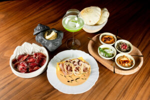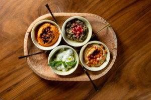 - Ассорти мезе — традиционные ближневосточные закуски: хумус, дзадзики, бабагануша и мухаммар. Все закуски подаются с лепешкой прямо из печи.