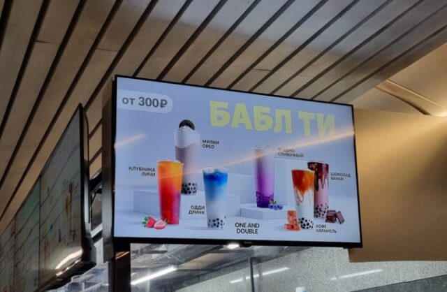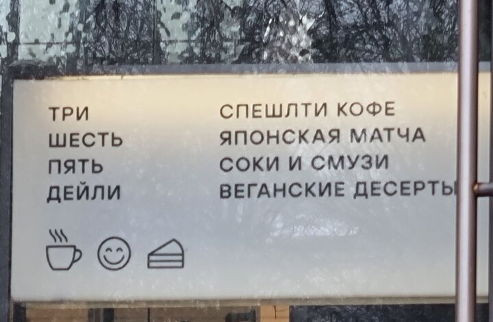 Кое-где, правда, английские слова уже поспешили написать русскими буквами, что, впрочем, выглядит смешно: «спешлти кофе», «дейли», «бабл ти».