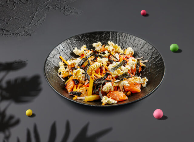 — Маки ролл салат (680 руб.). Нестандартная интерпретация подачи салат на азиатский лад. В его составе – водоросли нори, рис, нежный лосось, сливочное авокадо, свежие огурцы, тунец и попкорн. Блюдо дополняется кунжутом и соусами васаби и терияки.